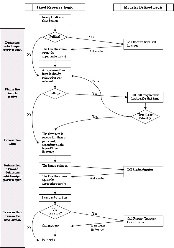 When the fixed resource becomes ready to receive a flow item, it checks first to see if it is in Pull mode. If it is in Pull mode, then it calls the Pull Strategy function. This function returns a value of the input port number to open. If 0 is returned, then it will open all input ports. When an upstream item is released, it calls the Pull Requirement field for that item. This field should return a true (1) or false (0). If true, then it receives the flow item. If false, then it tries calling the Pull Requirement function again for the next flow item that has been released, or waits until another flow item is released by an upstream fixed resource. It continues this loop until the Pull Requirement returns a yes (1) for a particular item, upon which it receives that item. If the object is not in Pull mode, however, then the fixed resource skips all of the pulling logic, and simply waits for the first flow item that becomes available.