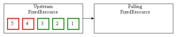 The above diagram shows two fixed Resources. The pulling fixed resource is set to pull from the upstream fixed resource. The upstream fixed resource has released 3 of its flow items (green), while 2 flow items are still being processed (red). When the pulling fixed resource is ready to receive one of the upstream fixed resource's flow items, it calls its Pull Requirement function for each of the 3 released flow items, until the Pull Requirement function returns a yes (1). As soon as a yes is returned, the pulling fixed resource will receive that item and finish its pulling logic, until it is ready to receive the next flow item. If all of the 3 calls to Pull Requirement return a no (0), then the pulling fixed resource will wait. When flow item 4 is released later in the simulation, the pulling fixed resource will then call Pull Requirement for item 4, and if it returns yes, item 4 will be received. If it returns no, this process will repeat until a flow item is found that meets the Pull Requirement.