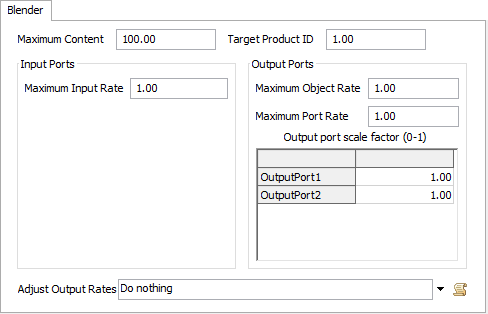 Because the Blender controls how much it pulls from each port at any point in time, the modeller does not have access to the maximum port rate or the input port scale factors. They can, however, edit the object's maximum input rate. The user has complete control over the output rates and scale factors. They can change these values with the AdjustOutputRates function, which fires every tick. This allows them to update the output rates and scale factors as the model is running.