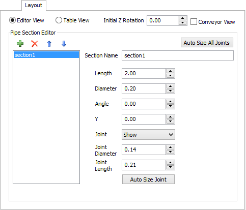 The modeller can change the look of the Pipe by editing the Pipe's Layout Table. Each row of the table represents a single, straight section of the Pipe. The modeller can define how long the section is and what its diameter is. They can also specify the angles around the Z and Y axis that the pipe will rotate for the next section. There is also a column that allows the modeller to state whether or not the joint between this section and the next one will be drawn. By editing this table, the modeller can make the Pipe look however they need. The modeller also has the option of displaying the Pipe as a simple conveyor. When the Pipe is drawn as a conveyor, the Layout Table is still followed, only the option to display the joints between sections is ignored.