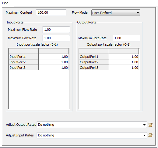 The modeller also selects an output flow mode. There are three modes available. The first flow mode is called "Flow Evenly." In this mode, the Pipe attempts to divide the output rate evenly between the output ports. The second flow mode is called "First Available." In this mode, the Pipe tries to send all of the material that is ready to be sent to the first output port. If that object can not receive it all, the Pipe tries to send it to the next port, and so on. The third mode is called "User-Defined." This mode allows the modeller to edit the maximum port input and output rates, as well as the port scale factors. The modeller also has access to the AdjustInputRates and AdjustOutputRates functions. Unlike the other fluid objects, the modeller can read but can not change the object input and output rates using these two fields.