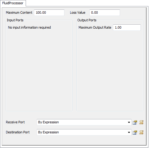 The FluidProcessor receives and sends material based on an over-all rate that the modeller specifies. The modeller specifies the maximum output rate of the Processor. This value is used to determine the input rate as well. The actual output rate is based on the rate that material came in. Material will leave at the same rate that it entered, unless the output is, for some reason, lowered (such as the downstream object closing its input ports or breaking down). If this happens, the material will "back up" in the Processor and more will be available to send when the downstream object can receive more again. Once the downstream object has received all of the "backed up" material, the output rate will go back to the input rate. The amount of time that material spends in the Processor is based on the Processor's maximum output rate and its maximum capacity.