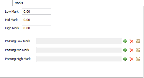 The modeller can define three points that will cause triggers to fire when the content of the Tank reaches them. These points are called "Marks". Whenever the content of a Tank passes one of these marks (either rising or falling), a trigger is fired. The user can use that trigger to open or close ports, send messages, change rates, or many other things. If two or more marks are set for the same value, the trigger for only one of them will fire. For example, if the low mark and the mid mark are both set to 10, when the content in the Tank changes from 9 to 10 only the trigger for the low mark will fire.