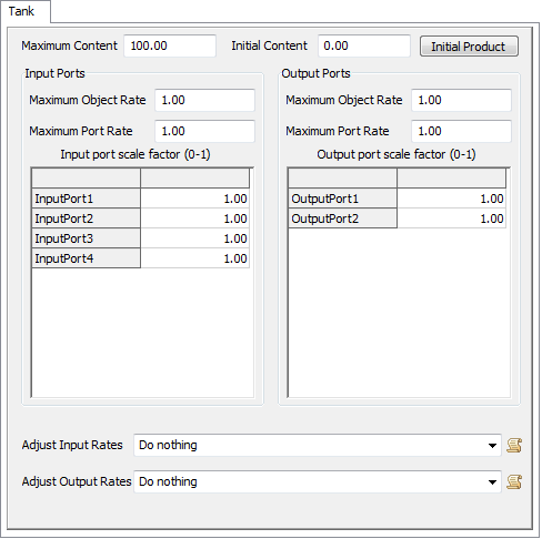 The Tank can start a model with no content, or with a set amount. If the tank begins with content, that is all it will create during a run. It may continue to receive material from upstream, however. Starting with a fixed content value is very useful for models that have a fixed amount of material that will enter. If the modeller wants a constant or infinite stream of incoming material, they should use a FluidGenerator instead.