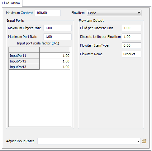 Once a flow item is created, the standard Send To Port logic is used to send it downstream. This means that the FluidToItem can send flow items to any of the discrete objects and can call operators to do the transporting. The modeller can define how the input to the FluidToItem works by changing the maximum object input rate, maximum port input rate and the port scale factors using the GUI and the AdjustInputRates function.
