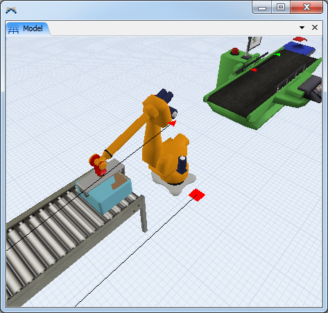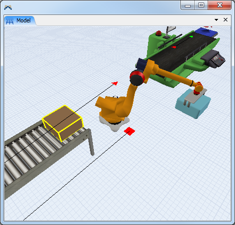 1. Press the model Step button (in the simulation run panel) to advance the model run forward by event until a FlowItem appears at the end of the conveyor ready for pickup. You may need to recheck the Planner Item checkbox if you reset the model since the robot hides the item when the model is reset.