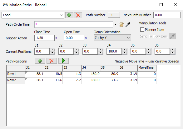 • If Path Cycle Time = 0 and MoveTime column fields > 0 - When the Path Cycle Time field returns a 0, the Robot will use the sum of the values in the MoveTime column as the cycle time for the path. In this way you have precise control of the move time from each position to the next. This method can also be used to insert a stop delay in the movement; set 2 rows in sequence to the same position and use the MoveTime as the delay time.