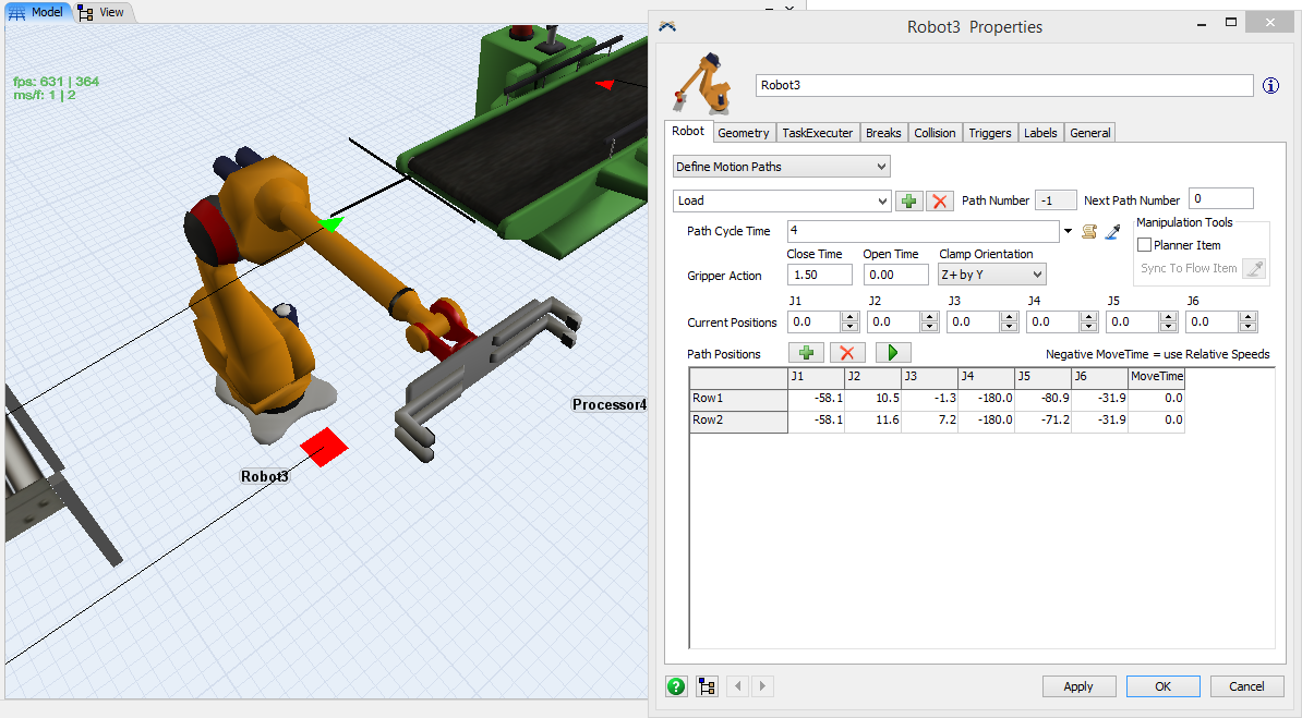 • Negative Move Time affects animation only (Relative Speeds) - For a given movement within a path, if the MoveTime value is a negative value the Robot will still treat it as if it were positive, however the joint speeds will be adjusted such that they are proportional to the Relative Speeds entered in the Robot Geometry tab. Note that this is purely a change in the animation and does not affect the movement cycle time. Usually, entering the actual max speed of each joint (from manufacturer) into the Relative Speeds will give best results.