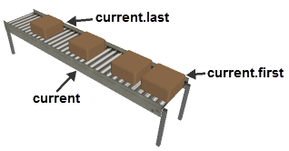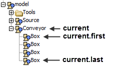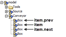This example sets curnode to the 3rd ranked object in the object named "Conveyor3" in the model. This provides an advantage over the first example since often flowitems will all have the same name, so the path "/Conveyor3/Textured Colored Box" will only give you access to the first flowitem named "Textured Colored Box" in Conveyor3. If several flowitems are in Conveyor3 and all have the name "Textured Colored Box", then you can use the path "/Conveyor3/2" to get the 2nd ranked flowitem, the path "/Conveyor3/3" to get the 3rd ranked flowitem, and so forth.
