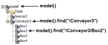 example, model().find("/?FlowItemBin") will search for a node with the name FlowItemBin in the model tree.