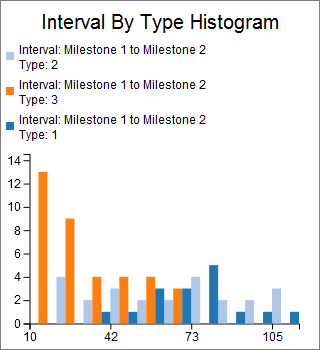 This template creates a Histogram, which shows the distribution of Interval times for each specified Interval, for each unique type. Each color represents a combination of Interval and Type.