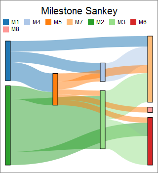 This template creates a Sankey Diagram, which shows how items flow from one Milestone to the next. Thicker paths indicate that more items flow between two milestones.