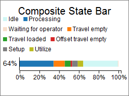 This composite template creates a bar chart, and calculates utilization based on each object's time in various states. Each segment of the bar chart represents the average proportion of time spent in one of the object's states. The utilization shown is the average utilization of all objects.