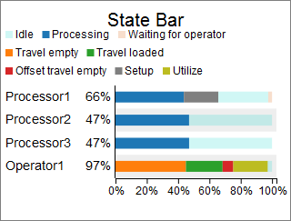 This chart template creates a bar chart, and calculates utilization based on each object's time in various states. Each segment of the bar chart represents the proportion of time spent in one of the object's states. There is one set of bars per object.