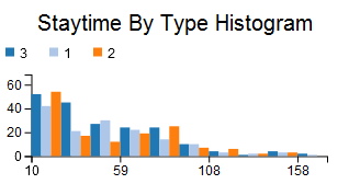 This template creates a histogram. Each bar on the histogram represents a range of staytime values. The height of each bar is determined by the number of staytime values that fit within that range. There is one set of bars for each unique Type value.