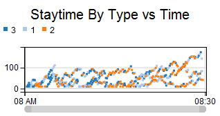 This template creates a time plot. Each point on the plot represents an item exiting the composite object. The color of each point represents the Type value of the exiting item. The position of the point is determined by when the item exited, and how long the item was within the composite object.
