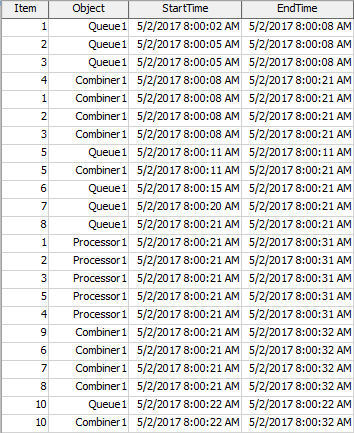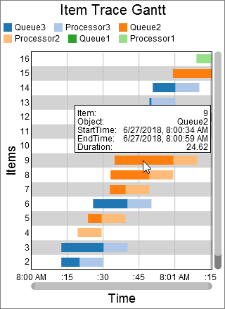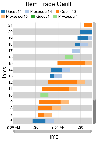 The Gantt chart provides performance measures based on the durations. The duration of a given row in the table is the difference between the End Time column and the Start Time column. The chart will provide the Average, Sum, Minimum, or Maximum of all durations as a performance measures. For each unique value in the Value column, the chart will also provide the Average, Sum, Minimum, or Maximum of all durations for that value as a performance measure.