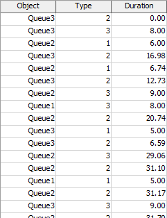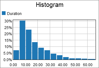 The data used to create the histogram is found in the Duration column. The other two columns are used to categorize each point. The chart shown at the beginning of this section categorized points first by the value in the Object column, then by the value in the Type column. Each unique Object column value adds an additional axis, and each unique Type value adds a unqiue color.