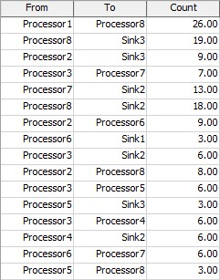 This chart assumes that each row of the Data Source contains information about individual links. One column will have a Source value, another will have a Target value, and a third will have a Weight value. The Target and Source values are used to determine the location of the link. The Weight value will determine the thickness. Here is the table for the chart shown above: