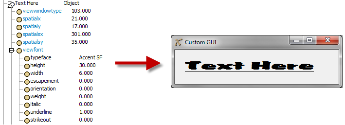 This attribute only applies to Windows Common Controls. It defines the font that the control will use. The viewfont attribute is a wrapper around the Windows API CreateFont() command. Add this attribute and give it sub-nodes defining the different parameters that will be passed into CreateFont(), as shown in the figure below. You can refer to Microsoft's Windows API documentation for more information on this.