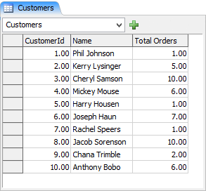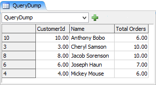 ORDER BYstatement defines how the result should be sorted. Here we sort by the Name column, which is a text column and thus will be sorted alphabetically. You can optionally putASCorDESCto define if you want it sorted in ascending order or descending order. Default is ascending. You can also have multiple comma-separated expressions defining the sort. The additional expressions will define how to order things when there is a tie. For example, the expressionORDER BY [Total Orders] DESC, Name ASCwould first order descending by the number of total orders, and then for any ties (Cheryl Samson and Jacob Sorenson both have 10 total orders) it would sort alphabetically by name. - The