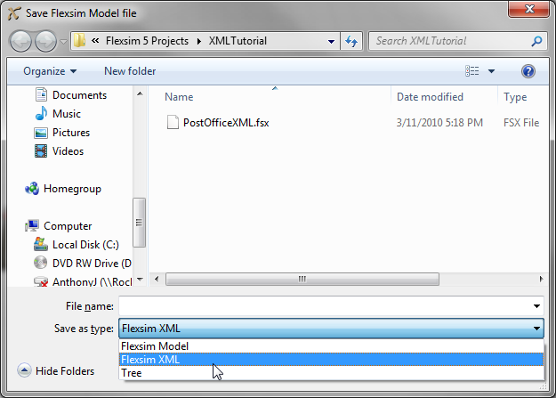 Save the model, and in the save dialog, choose "FlexSim XML" from the drop-down at the bottom. Save the model as "PostOfficeXML.fsx".