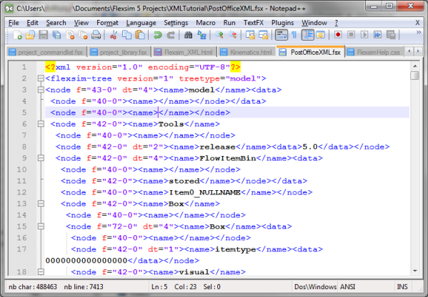 Now you've saved the file in FlexSim's XML format. You can view the file in a regular text editor like Notepad, Visual Studio, Notepad++, EditPlus, etc.