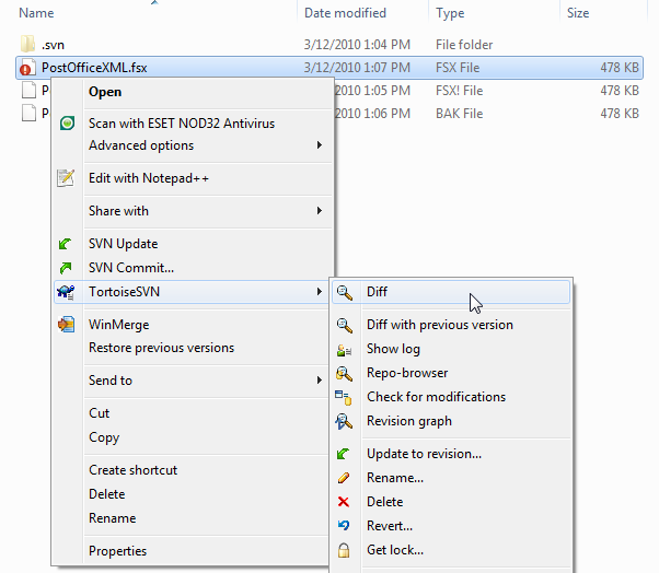 Once saved, you'll notice that the file's icon has changed to a red symbol, meaning the file is "dirty", or it has changed since the last check-in. You can also right-click the file, and see exactly what's changed by choosing the "Diff" operation. This will give you a difference comparison of your current copy of the file with the last version that you checked-in.