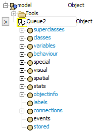 The following picture shows an expanded object attribute tree for the Queue object in the library tree.