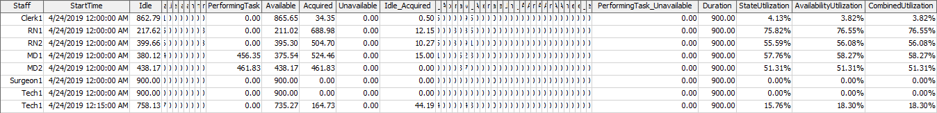 - CombinedUtilization - This column shows the utilization of the object for the interval, based on the combination of Staff and Availability states.