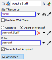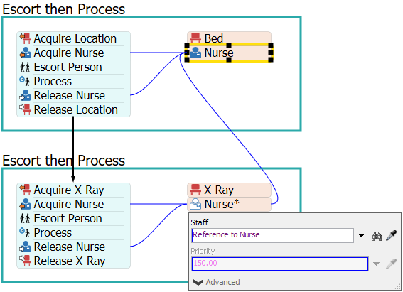 Each set of acquire and release activities and resource shared asset interface with their corresponding list to manage requests for the objects on the list. For example, the Acquire Staff activity acquires from a Staff Resource shared asset which then pulls from the Staff List in order to acquire a staff. When a staff is acquired, its priority column in the list is updated so it is unavailable to other acquire requests unless the staff is in a preemptable state and the new request is of a higher, preempting tier. The Release Staff activity makes the released staff member available to other acquire activities.