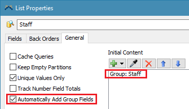 Each List is tied to one of the top level People Groups. This Group is automatically contained in the List's Initial Contents. When the model is reset all objects contained in the Group are pushed to the list and are then available to be acquired. The Automatically Add Group Fields checkbox is checked so that a Group field is added to the list for each Group containted in the top level Group.