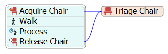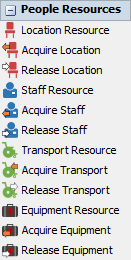 The People Resource Activities facilitate acquiring and releasing resources in a people-based model. For each type of resource (Locations, Staff, Transports, and Equipments) there is a corresponding resources shared asset, acquire, and release activity. A shared asset block is used to represent an object in the 3D model to be acquired. The corresponding acquire activity is used to request the object and waits until the object is acquired. The object is used for a time and then the corresponding release activity is used to release the object.