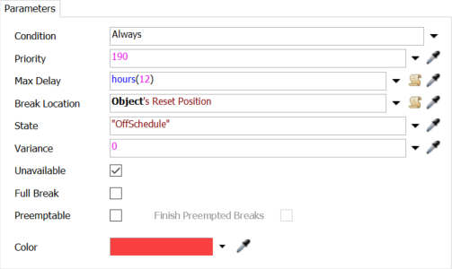People Down Behavior object are pre-configured Down Behavior objects that help provide Shift Schedule functionality. When a Time Table event occurs that uses this Down Behavior a token is created in the Shift Schedule process flow with label values based off the parameters set in the Parameters page. The token in the Shift Schedule flow will attempt to acquire the object going down in order to make them unavailable for acquiring by other things in the model. The parameters on this tab affect various aspects of how the resource is acquired and just how unavailable they are during the break.