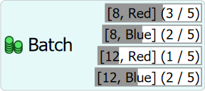 | Array | The tokens can be grouped into batches based on an array, which may contain multiple labels of various data types. Tokens being grouped by an array will only group together if all elements in the array match. For example, if items have a Size label of either 8 or 12 oz (number), and a Color label of either “Red” or “Blue” (string), you can group by the array [token.Size, token.Color]. This will create four groups, one for each possible outcome, as shown in this example. | ![]() |