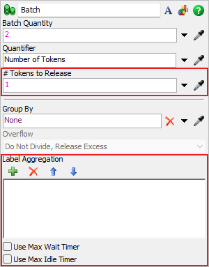 If the number specified in the # Tokens to Release box is greater than the number of tokens collected in the batch, the Batch activity will create and release new tokens. These new tokens will have no initial labels. Labels may be created on these new tokens by using the Label Aggregation. See Assigning Labels to Outgoing Batches for more information. These new tokens will be the last to leave the Batch activity.