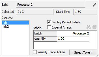 The Batch dialog box can be opened by clicking on the batch displayed on the Batch activity. This dialog box gives information on the selected batch and lets you see which tokens are currently in the batch.