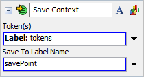The Save Token Context activity saves the current activity context of one or more tokens to a user-defined label on those tokens. The saved context includes the token's current activity, as well as any activity-related data. For example, if a token is in a Delay activity, it will save off the total delay time as well as how far into the delay the token is currently.