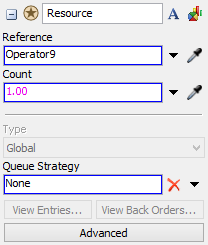 By default, acquire requests are processed in FIFO (first in first out) order, and in object mode the resource objects themselves are distributed in FIFO order. If a Default Query or a Queue Strategy is used on the Resource or if any Acquire Resource activity that references this Resource uses a Query, the Resource will switch over to using a List. This List will be internally owned by the Resource. This allows the Resource to utilize the built in SQL functionality of the List to determine which tokens to allocate resources to first and which resources should be allocated. Through the Advanced button, you can set up additional fields for the List that can be used in the Query and Queue Strategy properties.