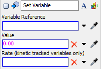 Variables can be set to many different types of data using the Value property. This includes numbers, strings, node references, arrays, etc. The Rate property is specific to kinetic tracked variables and is ignored for all other variable types. If you want to set the rate of a kinetic tracked variable but not change its current value, you can remove the value by clicking the Delete button to the right of the Value property.