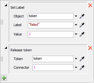 By default, the Set Label operation will create a label on the token that is called failed and assign it a value of 1 (which will represent a value that is set to true). The Release token operation will then release the token through connector 1. (See Adding and Connecting Activities - Number of Outgoing Connectors for more information about connector numbers.)