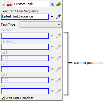 The custom properties are not available until after you select a task from the Task Type menu. The names of the properties will change based on the task you selected. Each box will represent one of the parameters that are required or optional for that task. See the Task Sequence Types reference for a description of the parameters for each task type.