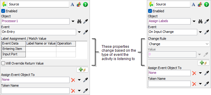 The Event-Triggered Source activity creates tokens in response to an event during a simulation run. When that event occurs, it will create a token. If the event has data associated with it like a flow item or port number, you have the option to save that data off as a label on the created token. If the data is an object like a flow item, a reference to that flow item will be saved on the token label for later use. You can also assign a name to the created token.