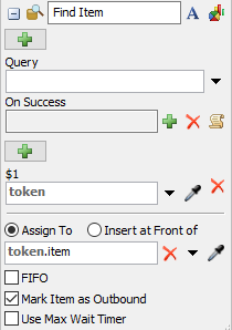 By default, the token will wait in the Find Item activity until an item is found. The queries will be reevaluated each time a new item enters the storage system. You can specify a Max Wait Timer and release a token after a specified amount of time if it has not found an item.