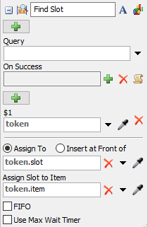By default, the token will wait in the Find Slot activity until a slot is found. The queries will be reevaluated each time an item exits the storage system, freeing up space in a slot. You can specify a Max Wait Timer and release a token after a specified amount of time if it has not found a slot.