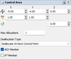 Note that A* travelers deallocate the control area as soon as their center point leaves the control area. In other words, they do not reference the control area's Deallocation Type. Also, a control area will be allocated based only on the A* grid nodes that it encompasses, so you should make sure the control area properly surrounds the correct set of grid nodes.