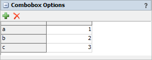 The list of name-value pairs that will be displayed in the combo box list. The name is shown in the combo box's list and the value is the value applied to the control's linked node when selected from the list. Values must be numeric.