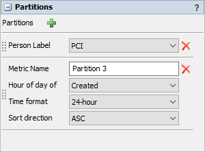The Partitions area allows you to specify the way the result table should be partitioned, if at all. Each partition allows you to specify the Partition Name and the Sort Direction. Other properties depend on the kind of partition you have added.
