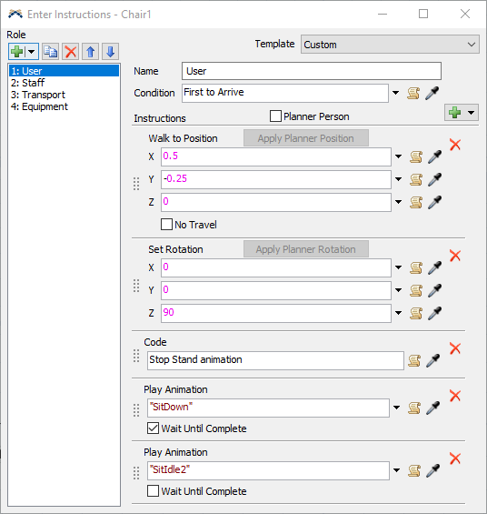 This and all other options below become available if Template is set to Custom. The Role listbox defines the different roles an entering person may assume. For example, a person flowitem entering a bed could use a Patient role which details a list of instructions to make the person lay in the bed. Whereas a staff object could use a Staff role with a list of instructions to walk to the side of the bed and start a stethoscope animation. The list defines all the possible roles, with their associated instruction set, used by this object. When a person enters the location they will assume the first role from the top that they satisfy the condition for. Sub roles can also be defined inside a role. This allows a set of instructions to be executed for a role, and then the person will also assume the first sub role within that role to assume.