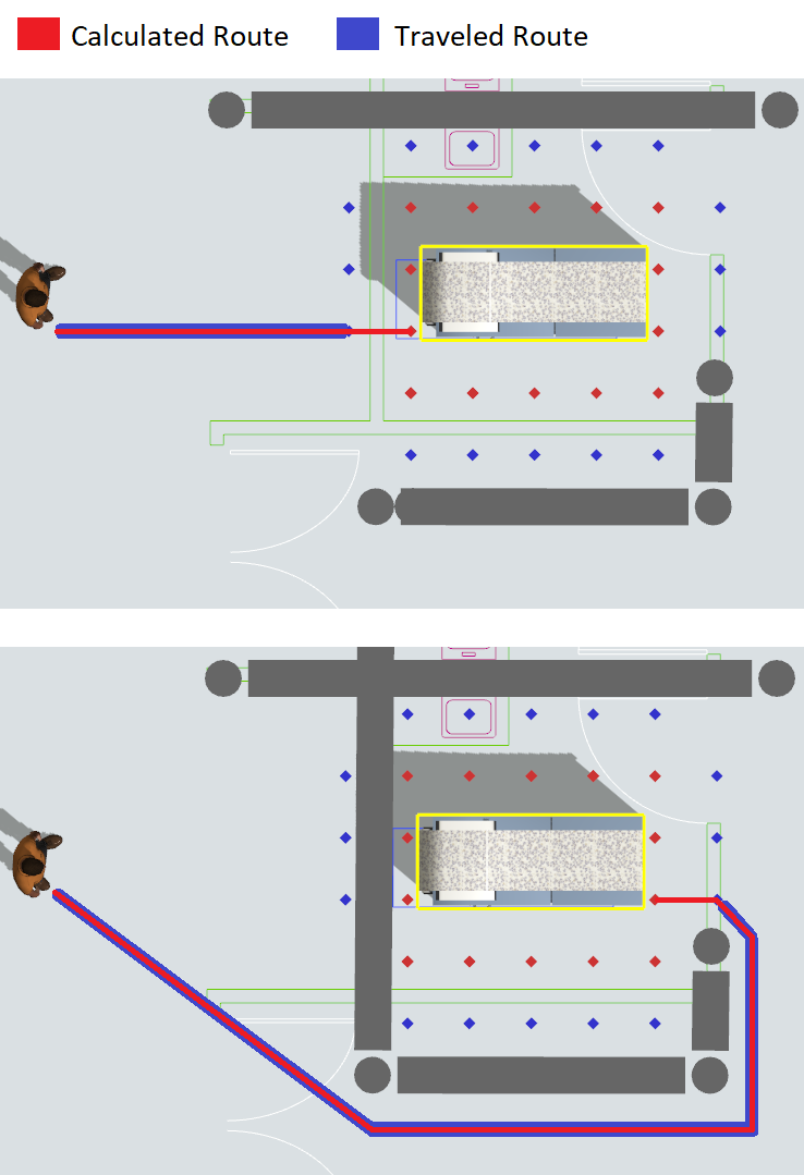 The A* network also supports acceleration and deceleration for objects traveling on the network. Generally this is intended to enable simulation of free-roaming autonomous mobile robots, not necessarily people. If you are simulating people, such as in the people module, some of the effects of using acceleration / deceleration may be disadvantageous for that scenario (see below), so it may be better to just set their acceleration and deceleration properties to 0. The Create Person activity automatically does this when attaching a created person to the A* network.